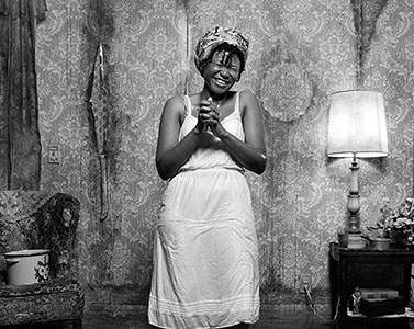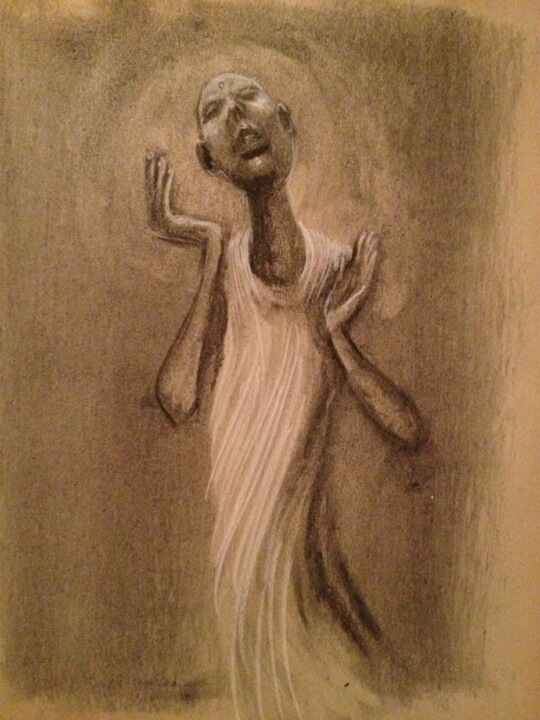 She emerges, covered in a white choir robe. Her hair is closely cropped, like mine. Her matronly dress and braided wig lost. She is conducting church services – for herself, by herself. She is the choir, the audience and the minister, all at once. Her faith, if not her mind, intact.