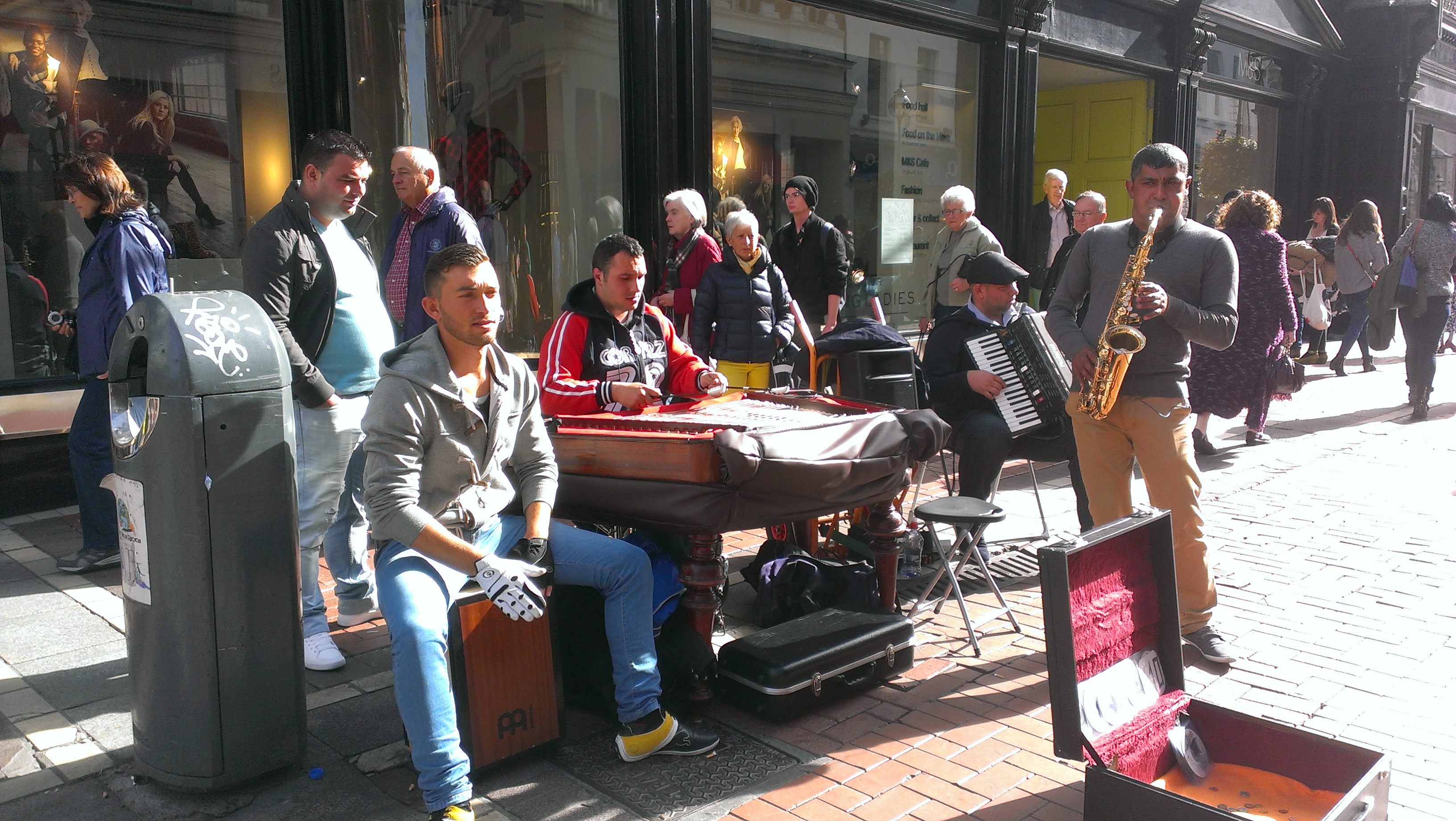 I meet Steven in front of the bank at the corner of Grafton and Nassau Streets, eager to share my finds. I take him for Pad Thai and to St. Stephen’s Green, stopping first in front of a band set up on the street. There is a cajon, a xylophone, an accordion. A saxophone that sounds like a snake charmer. I grab Steven’s hand and we break into spontaneous dance in the street – swing style.