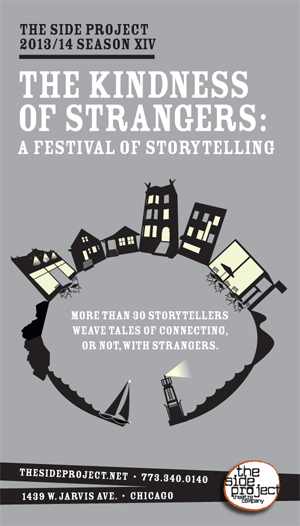 And then, “A 3-week rotating mix of more than 30 storytellers weaving tales of connecting, or not, with strangers.”  The words encircled by drawings, like a globe – buildings, a boat and a lighthouse, water.