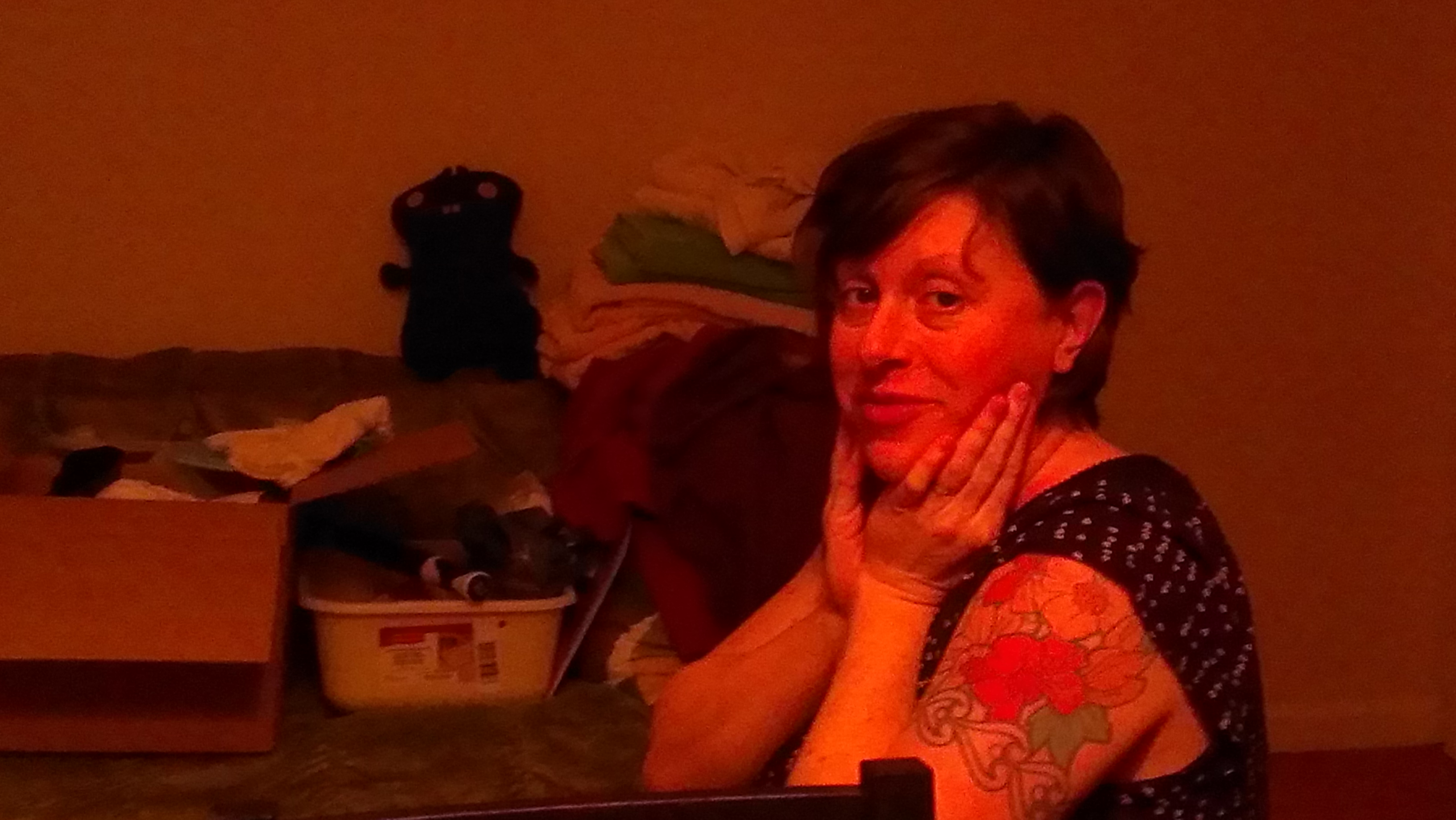It is warm inside. Clover gives me one of her t-shirts. It is grey and oversized with butterflies on it. My friend Julie’s mother Carole (now deceased) often visits both her and I as a butterfly. I know she is with us now.